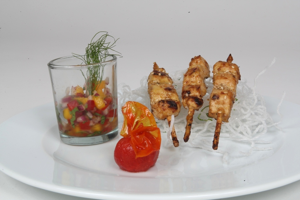 Brochetas de pollo, mango manzano